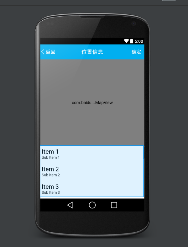 布局文件就是上面是一個百度地圖的mapview,下面是一個顯示周邊位置的ListView,很簡單。