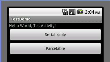 <?xml version="1.0" encoding="utf-8"?> <LinearLayout xmlns:android="http://schemas.android.com/apk/res/android" android:orientation="vertical" android:layout_width="fill_parent" android:layout_height="fill_parent" > <TextView android:layout_width="fill_parent" android:layout_height="wrap_content" android:text="@string/hello" /> <Button android:id="@+id/serButton" android:layout_width="fill_parent" android:layout_height="wrap_content" android:text="Serializable"/> <Button android:id="@+id/parButton" android:layout_width="fill_parent" android:layout_height="wrap_content" android:text="Parcelable"/> </LinearLayout>