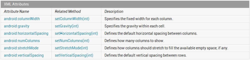 通過查看GridView的API幫助文檔(http://developer.android.com/reference/android/widget/GridView.html),可以了解到GridView的常用xml屬性如圖2所示。