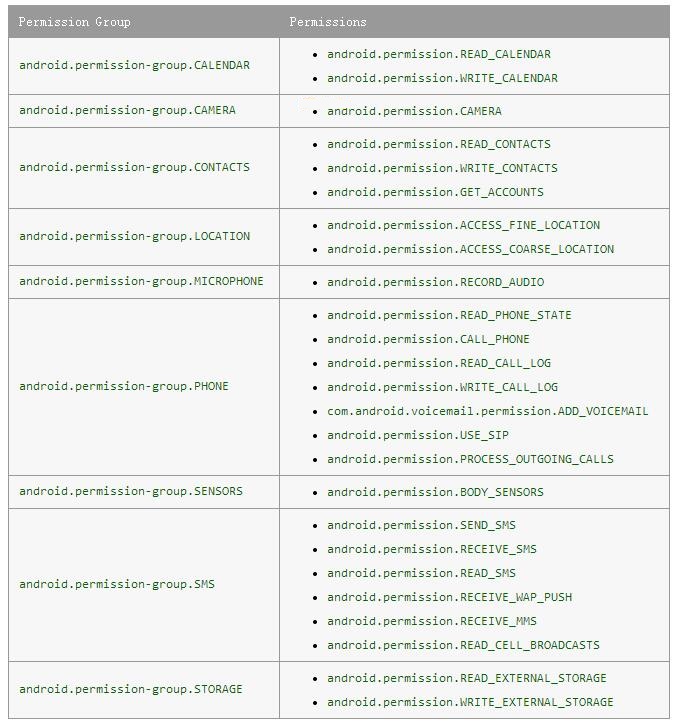同一組的任何一個權限被授權了,其他權限也自動被授權。例如,一旦WRITE_CONTACTS被授權了,app也有READ_CONTACTS和GET_ACCOUNTS了。
