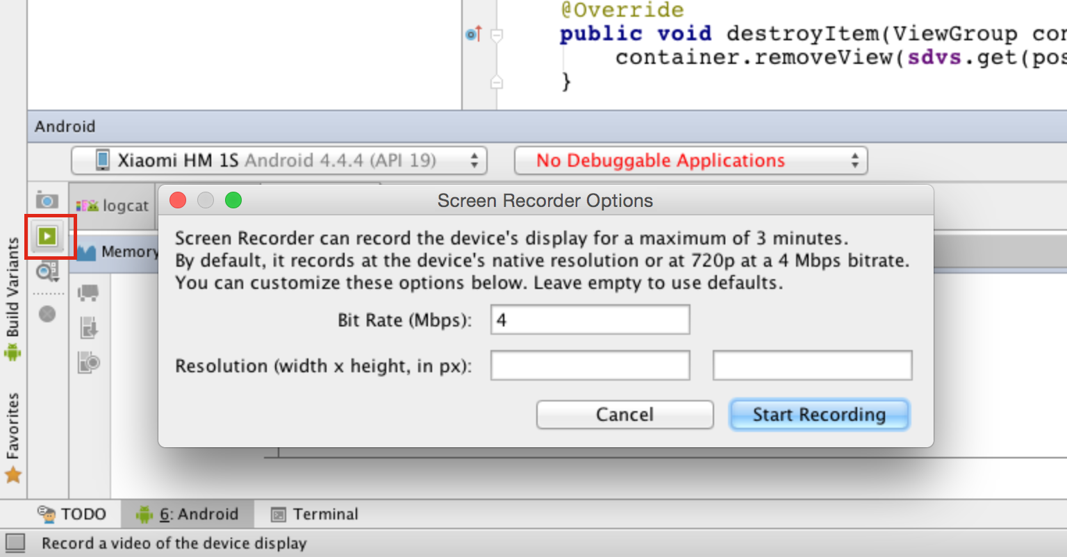 在 Android Studio 最下方的Android欄左邊有一個按鈕(下圖紅框圈出的部分),點擊就可以實現錄屏。還可以選擇比特率、分辨率等,分辨率沒空則采用默認值。