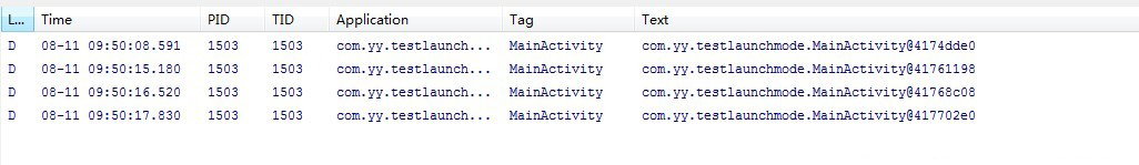 從圖中可以看出,總共打印了4次(活動啟動+3次點擊按鈕),每次的活動實例都不用,從而驗證了活動啟動模式standard。