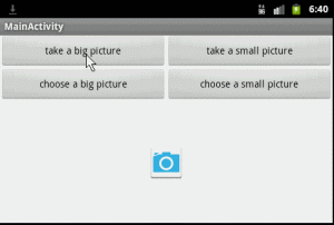 Intent intent = new Intent(MediaStore.ACTION_IMAGE_CAPTURE);//action is capture intent.putExtra(MediaStore.EXTRA_OUTPUT, imageUri); startActivityForResult(intent, TAKE_BIG_PICTURE);//or TAKE_SMALL_PICTURE