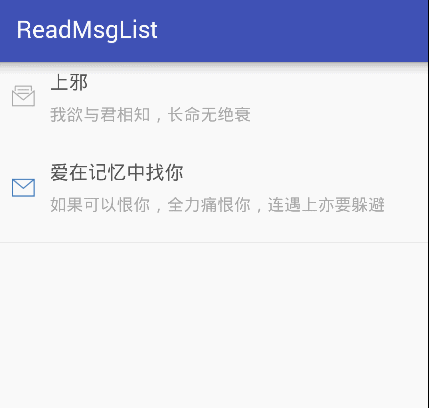 在上一篇《Android仿微信滑動彈出編輯、刪除菜單效果、增加下拉刷新功能》裡,已經帶著大家學習如何使用SwipeMenuListView這一開源庫實現滑動列表彈出菜單,接下來,將進一步學習,如何為不同的list item呈現不同的菜單,此處我們做一個實例:Android 高仿QQ滑動彈出菜單標記已讀、未讀消息,看下效果圖: