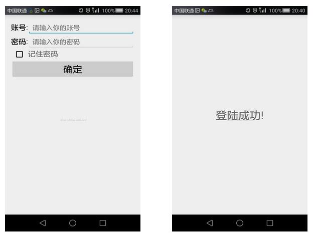 <TableLayout xmlns:android="http://schemas.android.com/apk/res/android" xmlns:tools="http://schemas.android.com/tools" android:layout_width="match_parent" android:layout_height="match_parent" android:paddingBottom="@dimen/activity_vertical_margin" android:paddingLeft="@dimen/activity_horizontal_margin" android:paddingRight="@dimen/activity_horizontal_margin" android:paddingTop="@dimen/activity_vertical_margin" android:stretchColumns="1" tools:context=".MainActivity"> <TableRow> <TextView android:textSize="20sp" android:text="賬號:" android:textColor="#000" android:layout_height="wrap_content"/> <EditText android:id="@+id/account" android:hint="請輸入你的賬號" /> </TableRow> <TableRow> <TextView android:textSize="20sp" android:text="密碼:" android:textColor="#000" android:layout_height="wrap_content"/> <EditText android:id="@+id/password" android:hint="請輸入你的密碼" android:password="true" /> </TableRow> <TableRow> <CheckBox android:id="@+id/remember_password" android:layout_height="wrap_content" android:layout_gravity="center"/> <TextView android:textSize="20sp" android:text="記住密碼" android:layout_height="wrap_content"/> </TableRow> <TableRow> <Button android:id="@+id/button" android:layout_span="2" android:text="確定" android:textSize="25sp"/> </TableRow> </TableLayout>