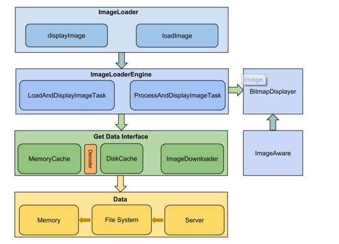 ImageLoader收到加載及顯示圖片的任務,ImageLoaderEngine分發任務,獲得圖片數據後,BitmapDisplayer 在ImageAware中顯示。