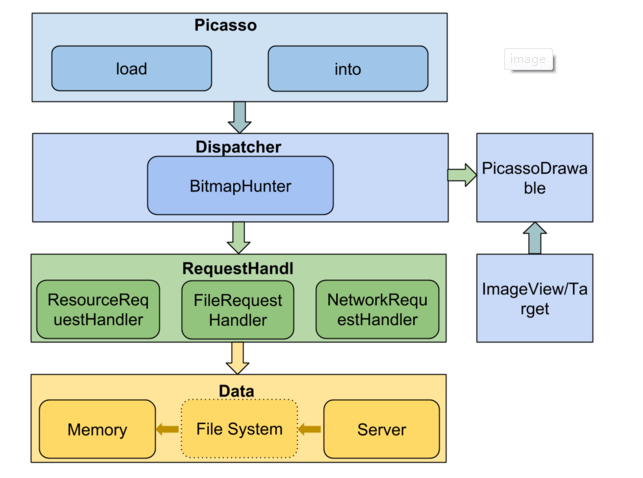 Picasso收到加載及顯示圖片的任務,Dispatcher 負責分發和處理,通過MemoryCache及Handler獲取圖片,通過PicassoDrawable顯示到Target中。