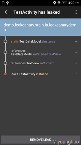 下面是demo中TestActivity中的TextView被靜態變量引用導致無法回收引起的內存洩露的截圖。