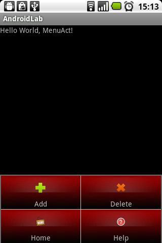 <?xml version="1.0" encoding="utf-8"?> <menu xmlns:android="http://schemas.android.com/apk/res/android"> <item android:id="@+id/menu_add" android:title="Add" android:icon="@drawable/menu_add"></item> <item android:id="@+id/menu_delete" android:title="Delete" android:icon="@drawable/menu_delete"></item> <item android:id="@+id/menu_home" android:title="Home" android:icon="@drawable/menu_home"></item> <item android:id="@+id/menu_help" android:title="Help" android:icon="@drawable/menu_help"></item> </menu>