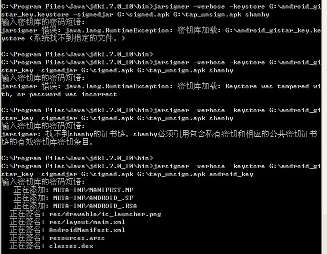 jarsigner這個exe在C:\Program Files\Java\jdk1.7.0_10\bin文件夾下。所以要用cmd進入這個文件夾