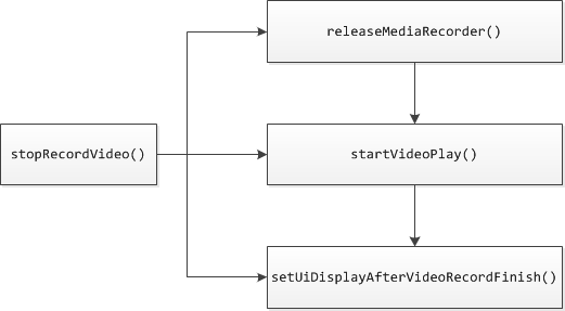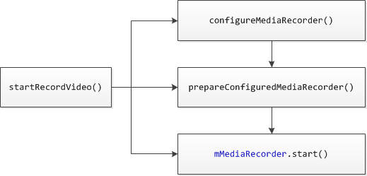 首先判斷當前錄制狀態,如果正在錄制,則先停止錄制,釋放MediaRecorder資源,鎖定攝像頭,置位錄制狀態;然後開始視頻錄制startRecordVideo,其boolean型返回值表征是否啟動成功,啟動成功後,開始視頻錄制計時,並且置位錄制狀態。startRecordVideo涉及MediaRecorder的配置,准備以及啟動。