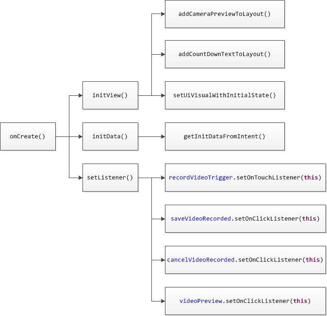 初始化過程主要包括View,Data以及Listener三部分。在初始化View時,添加攝像頭預覽,添加倒計時文本組件,設置初始狀態UI組件的可見;初始化Data時,從Intent中獲取初始數據;初始化Listener時,分別對錄制觸發按鈕,保存/取消視頻錄制按鈕以及視頻預覽界面添加監聽。