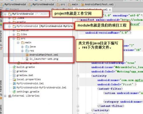 Ps:這裡說下這個project,android studio的 這裡的project和eclipse中的不一樣,這裡“new project”相當於創建一個新的workspace工作空間。而module其實就是eclipse所創建的project,剛剛開始使用的可能會不習慣。默認創建