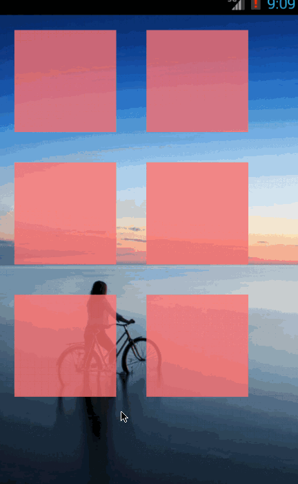 <LinearLayout xmlns:android="http://schemas.android.com/apk/res/android" xmlns:tools="http://schemas.android.com/tools" android:layout_width="match_parent" android:layout_height="match_parent" android:background="@drawable/d" android:orientation="vertical" tools:context=".MainActivity" > <LinearLayout android:layout_width="wrap_content" android:layout_height="wrap_content" android:orientation="horizontal" > <com.example.win8test.MyImageView android:id="@+id/MyImageView01" android:layout_width="108dp" android:layout_height="108dp" android:layout_margin="16dp" android:scaleType="matrix" android:src="@drawable/fen" /> <com.example.win8test.MyImageView android:id="@+id/MyImageView02" android:layout_width="108dp" android:layout_height="108dp" android:layout_margin="16dp" android:scaleType="matrix" android:src="@drawable/fen" /> </LinearLayout> <LinearLayout android:layout_width="wrap_content" android:layout_height="wrap_content" android:orientation="horizontal" > <com.example.win8test.MyImageView android:id="@+id/MyImageView03" android:layout_width="108dp" android:layout_height="108dp" android:layout_margin="16dp" android:scaleType="matrix" android:src="@drawable/fen" /> <com.example.win8test.MyImageView android:id="@+id/MyImageView04" android:layout_width="108dp" android:layout_height="108dp" android:layout_margin="16dp" android:scaleType="matrix" android:src="@drawable/fen" /> </LinearLayout> <LinearLayout android:layout_width="wrap_content" android:layout_height="wrap_content" android:orientation="horizontal" > <com.example.win8test.MyImageView android:id="@+id/MyImageView05" android:layout_width="108dp" android:layout_height="108dp" android:layout_margin="16dp" android:scaleType="matrix" android:src="@drawable/fen" /> <com.example.win8test.MyImageView android:id="@+id/MyImageView06" android:layout_width="108dp" android:layout_height="108dp" android:layout_margin="16dp" android:scaleType="matrix" android:src="@drawable/fen" /> </LinearLayout> </LinearLayout>