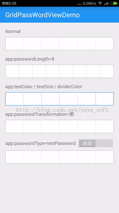 這個開源庫我研究了之後,又有了自己的一個思路:來個假的簡密框---底部放一個EditTextView,頂部放置6個ImageView的原點,控制他們的顯隱來實現這個簡密寬