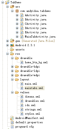 4、 src/com.andyidea.tabdemo包下面各個UI界面類源碼: