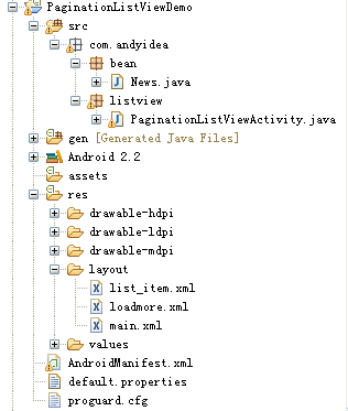 其中包 com.andyidea.bean中News.java類是新聞實體類,包com.andyidea.listview中paginationListViewActivity.java類是用來展示ListView列表。布局layout中包含三個布局文件,分別為:list_item.xml , loadmore.xml , main.xml 。下面分別貼下源碼: