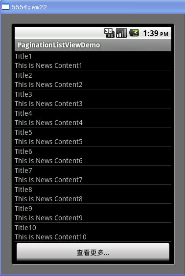 通過上面的截圖,當我們點擊"查看更多..."按鈕時,就會加載下10條記錄,當加載完所有的記錄後,ListView的底部視圖將會移除。