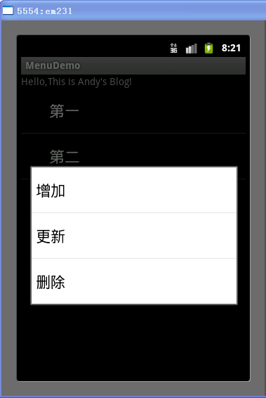 <?xml version="1.0" encoding="utf-8"?> <menu xmlns:android="http://schemas.android.com/apk/res/android"> <item android:id="@+id/add" android:title="增加"/> <item android:id="@+id/update" android:title="更新"/> <item android:id="@+id/delete" android:title="刪除"/> </menu>