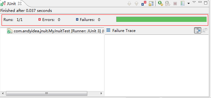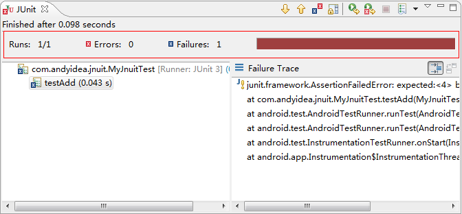 最後,打開eclipse中的outline窗口,其中會顯示單元測試類的所有的方法然後想要測試哪個方法,則在哪個測試方法上右鍵鼠標,選擇Run As,然後再選擇Android JUnit Test即可,如果是正常的,則會如下: