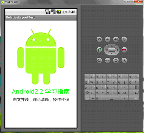 <?xml version="1.0" encoding="utf-8"?><RelativeLayout android:id="@+id/RelativeLayout01" android:layout_width="fill_parent" android:layout_height="fill_parent" android:background="#fff" xmlns:android="http://schemas.android.com/apk/res/android"><ImageView android:id="@+id/ImageView01" android:src="@drawable/android" android:layout_width="fill_parent" android:layout_height="wrap_content" android:layout_marginTop="40dip" > </ImageView> <TextView android:layout_height="wrap_content" android:layout_width="wrap_content" android:id="@+id/TextView01" android:text="Android2.2 學習指南" android:textColor="#0f0" android:textSize="28dip" android:layout_below="@id/ImageView01" android:layout_centerHorizontal="true" android:layout_marginTop="10dip"> </TextView> <TextView android:layout_height="wrap_content" android:layout_width="wrap_content" android:id="@+id/TextView02" android:text="圖文並茂,理論清晰,操作性強" android:textColor="#333" android:textSize="18dip" android:layout_below="@id/TextView01" android:layout_centerHorizontal="true" android:layout_marginTop="5dip“> </TextView> </RelativeLayout>