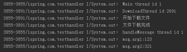 我們在Activity中創建了一個Handler成員變量uiHandler,Handler有個特點,在執行new Handler()的時候,默認情況下Handler會綁定當前代碼執行的線程,我們在主線程中實例化了uiHandler,所以uiHandler就自動綁定了主線程,即UI線程。當我們在DownloadThread中執行完耗時代碼後,我們將一個Runnable對象通過post方法傳入到了Handler中,Handler會在合適的時候讓主線程執行Runnable中的代碼,這樣Runnable就在主線程中執行了,從而正確更新了主線程中的UI。以下是輸出結果: