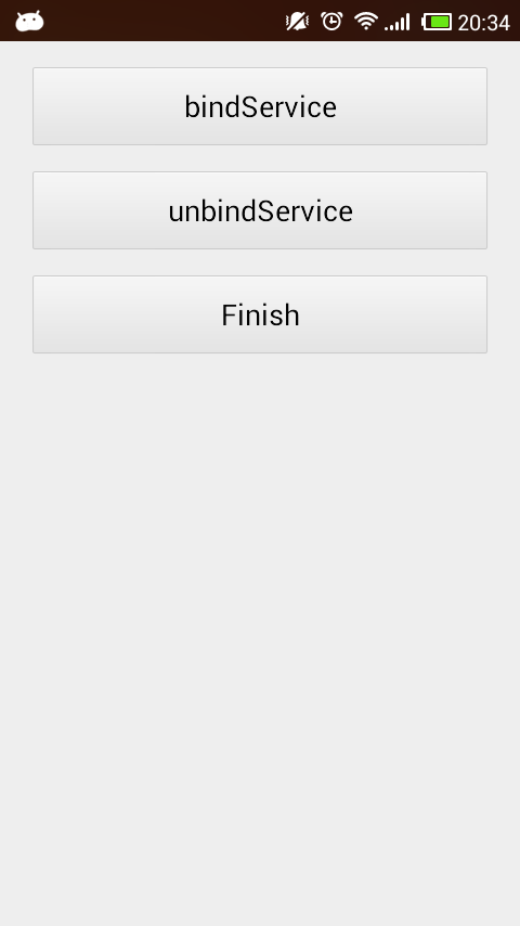 該測試也只涉及ActivityA,不涉及ActivityB。首先先點擊ActivityA中的“bindService”按鈕,然後點擊”Finish”按鈕,輸出結果如下圖所示: