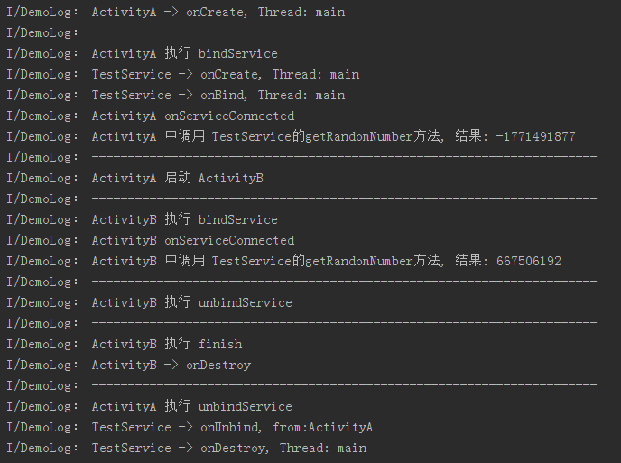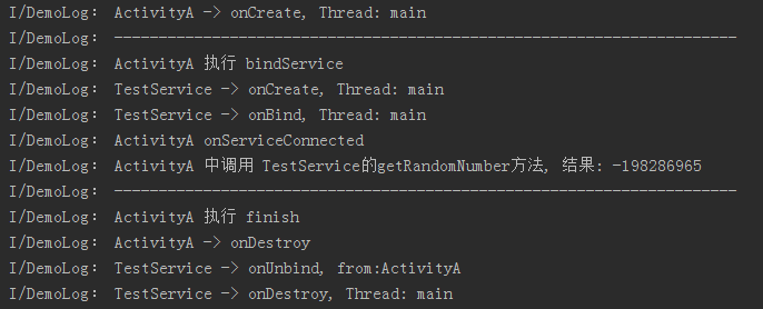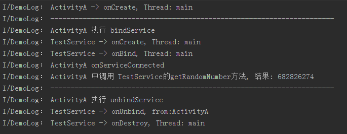 Log.i("DemoLog", "ActivityA 中調用 TestService的getRandomNumber方法, 結果: " + num);