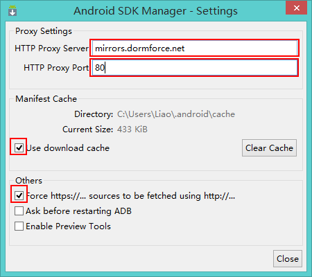 在『Android SDK Manager – Settings』窗口中,在「HTTP Proxy Server」和「HTTP Proxy Port」輸入框內填入mirrors.neusoft.edu.cn和80,並且選中「Force https://… sources to be fetched using http://…」復選框。設置完成後單擊「Close」按鈕關閉『Android SDK Manager – Settings』窗口返回到主界面;