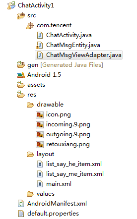 (2)文字顯示界面其實就使用了android:background="@drawable/incoming"這個東西。背景圖片的格式是xxx.9.png,專門用來縮放的,不然顯示效果非常差。
