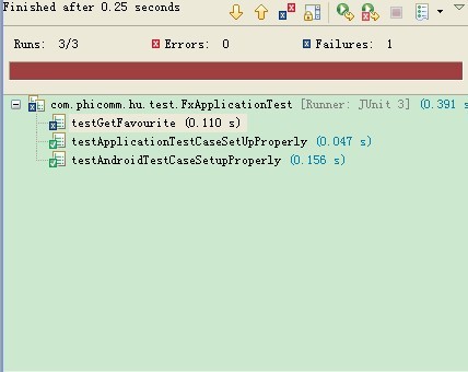 啟動android模擬器(也可以通過android手機)----->運行android工程----->在測試工程中選中測試類FxApplicationTest---->鼠標右鍵--->Run As---->Android Junit Test。這樣,測試結果就可以在eclipse的Junit視圖上顯示了,如下圖: