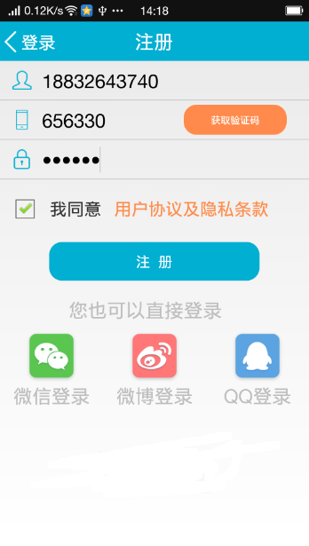 最後,我們來運行一下,看看我們的效果,由於小編的genymotion不知道為什麼不能運行了,所以委屈小伙伴們一下,看不了動態圖片了,不過並不影響,我們首先用一個號碼好注冊一下,如下圖所示: