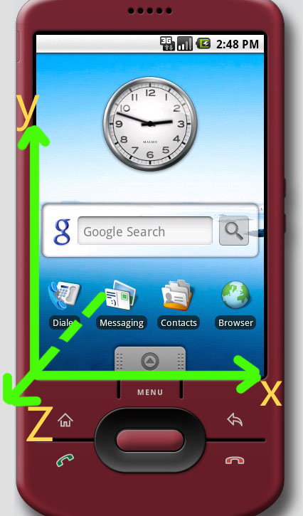 手機屏幕向上(z軸朝天)水平放置的時侯,(x,y,z)的值分別為(0,0,10);
