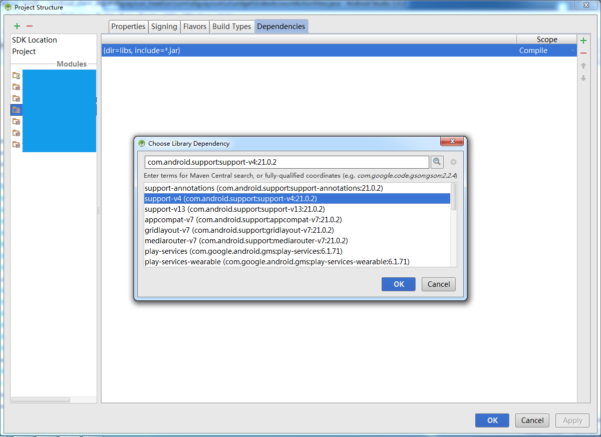 2、 打開project structrue(ctrl+alt+shift+s),找剛剛那個module,選擇Dependencies,點擊右邊的”+”號重新添加v4包即可。
