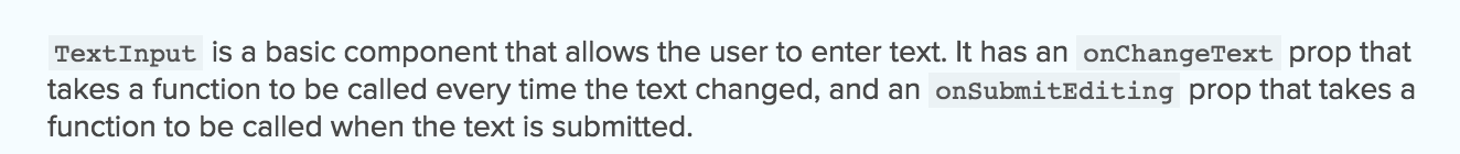 TextInput TextInput是允許用戶輸入文本的基礎組件。 他有一些屬性可以來幫助我們處理業務邏輯諸如onChangeText onSubmitEditing