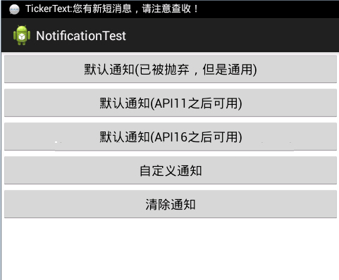 我們也知道Android系統也是在不斷升級的,有關Notification的用法也就有很多種,有的方法已經被android拋棄了,現在我實現了三種不同的方法,並適應不同的android版本。現在我就把代碼公布出來,我喜歡把解釋寫在代碼中,在這裡我就不多說了,先看效果圖: