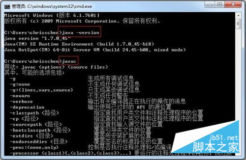 5、配置完畢後,通過cmd運行以下命令:java -version,javac 如果出現返回信息,則設置成功。