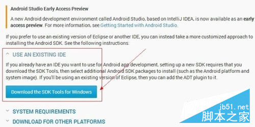 Andorid SDK為Android管理開發包工具,提供了Android各級平台的開發包和工具。注意,因為我們是獨立安裝,不是一體化(集成系列工具)所以需要單獨下載SDK。(如圖)