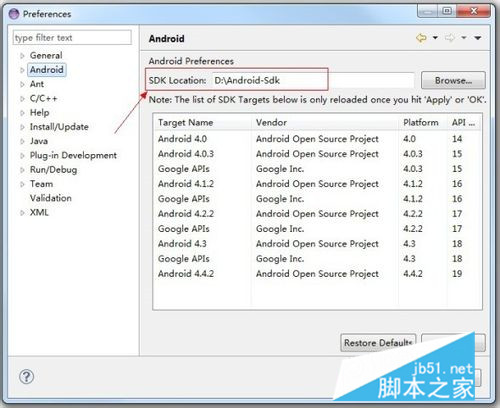 選擇 Window -> Preferences ,在彈出面板中就會看到Android設置項,填上安裝的SDK路徑,則會出現剛才在SDK中安裝的各平台包,按OK則完成配置。此時Android的環境就搭建完畢,可以進行Android項目的開發了。
