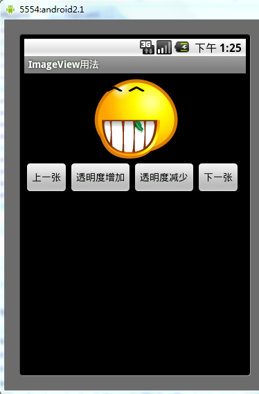 <?xml version="1.0" encoding="utf-8"?> <LinearLayout xmlns:android="http://schemas.android.com/apk/res/android" android:orientation="vertical" android:layout_width="fill_parent" android:layout_height="fill_parent"> <ImageView android:id="@+id/imageView" android:layout_width="wrap_content" android:layout_height="wrap_content" android:layout_gravity="center_horizontal" android:src="@drawable/p1"/> <LinearLayout xmlns:android="http://schemas.android.com/apk/res/android" android:orientation="horizontal" android:layout_width="fill_parent" android:layout_height="wrap_content" android:layout_gravity="center_horizontal"> <Button android:id="@+id/previous" android:layout_width="wrap_content" android:layout_height="wrap_content" android:text="上一張" android:layout_gravity="center_horizontal"/> <Button android:id="@+id/alpha_plus" android:layout_width="wrap_content" android:layout_height="wrap_content" android:text="透明度增加" android:layout_gravity="center_horizontal"/> <Button android:id="@+id/alpha_minus" android:layout_width="wrap_content" android:layout_height="wrap_content" android:text="透明度減少" android:layout_gravity="center_horizontal"/> <Button android:id="@+id/next" android:layout_width="wrap_content" android:layout_height="wrap_content" android:text="下一張" android:layout_gravity="center_horizontal"/> </LinearLayout> </LinearLayout>