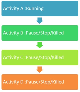 6.當前Activity處於被覆蓋狀態或者後台不可見狀態,即第2步和第4步,系統內存不足,殺死當前Activity,而後用戶退回當前Activity:再次調用onCreate方法、onStart方法、onResume方法,進入運行狀態。