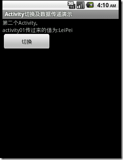 假定有兩個activity,分別是Activity01和Activity02,現在Activity01頁面中有一個按鈕,點下之後會切換到Activity02.並且在Activity切換時,Activity01給Activity02傳遞了一個參數. (intent可以在切換Activity時使用,且能傳遞數據.)