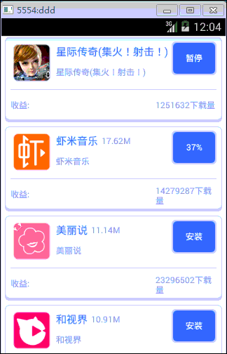 首先聲明一點: 這裡的多線程下載並不是指多個線程下載一個 文件,而是每個線程負責一個文件,今天給大家分享一個多線程下載的 例子。先看一下效果,點擊下載開始下載,同時顯示下載進度,下載完成,變成程安裝,點擊安裝提示安裝應用。
