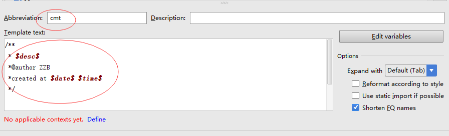 5.填寫Abbreviation,我這裡填的是cmt,也即你這個注釋的快捷方式,你敲cmt加回車,模板就出來了
