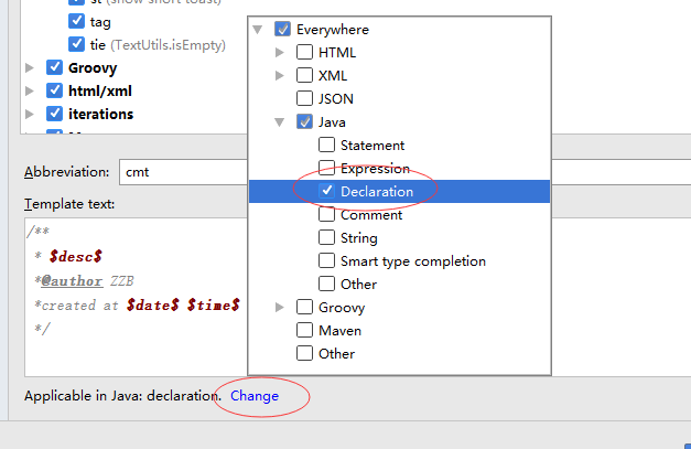 6.要設置你這個cmt快捷鍵在哪裡生效,我的選擇是在聲明的時候生效,也即你在方法名上打cmt加回車就可以了