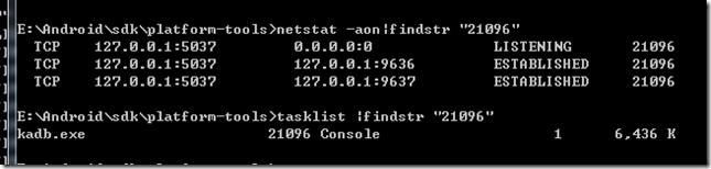 百度google大家多說的是任務管理器 kill掉adb 或者重啟adb server,但我任務管理器就沒有adb ,猜測是某個程序占用了adb端口。於是按此思路查找。