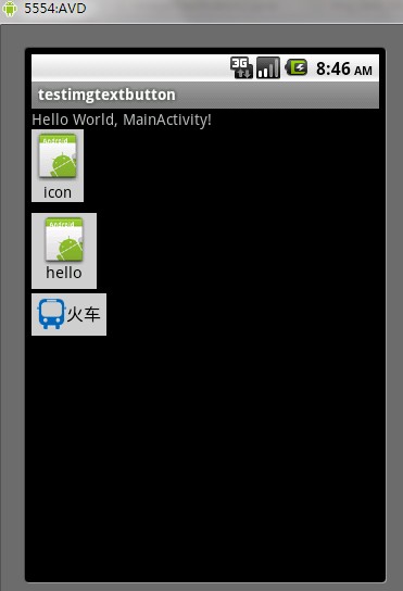 <com.test.ImageTextButton2 android:id="@+id/bt2" android:layout_marginTop="10dp" android:text="hello" android:textSize="15dp" android:textColor="#000000" android:layout_width="60dp" android:layout_height="70dp" android:background="@drawable/button_bg" />