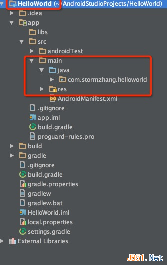 2、上述目錄中將java代碼和資源文件(圖片、布局文件等)全部歸結為src,在src目錄下有一個main的分組,同時劃分出java和res兩個文件夾,java文件夾則相當於Eclipse下的src文件夾,res目錄結構則一樣.