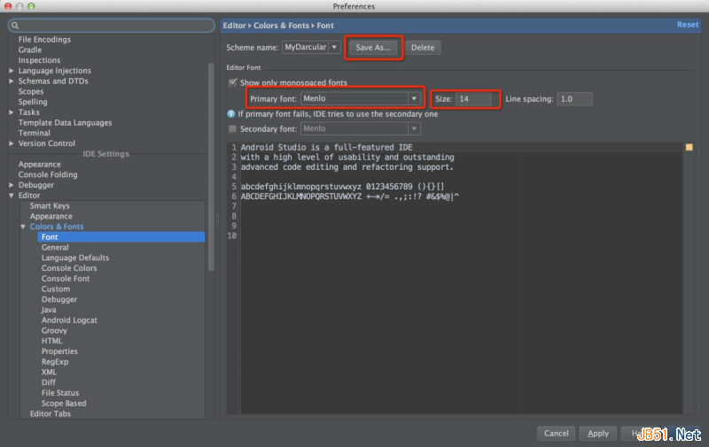 進入後你也許發現字體大小或者樣式不符合你的習慣,比如我是覺得代碼太小看起來傷眼,Darcular主題默認的字體是12,我個人更習慣14的字體大小。沒關系,到 Preferences (設置)頁面搜索 Font 找到 Colors&Fonts 下的 Font 選項,我們可以看到默認字體大小是12,但是無法修改,需要先保存才可以修改,點擊 Save as 輸入一個名字,比如 MyDarcular,然後就可以修改字體大小和字體樣式了.