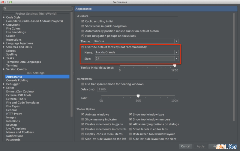 強迫症的你肯定無法忍受,沒關系,這裡也同樣可以設置,到 Preferences -> Appearance 修改如圖所示就ok,這裡同樣不僅可以更改字體大小,也可以選擇不同的字體,點擊OK,這次頁面字體就完全對你胃口了。